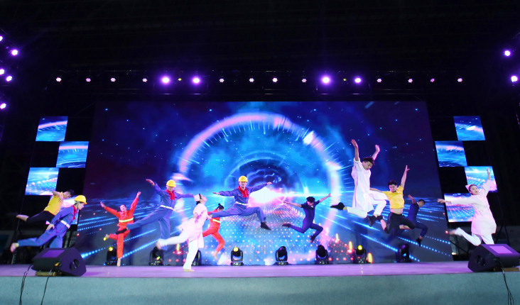 演出在大型舞蹈《我們都是追夢人》中拉開序幕。深中通道建設(shè)者帶來了詩朗誦《鑄夢深中》,展現(xiàn)了中交人 “交融天下,建者無疆”的胸襟與魄力,女子群舞《青花瓷韻》傳遞了中國傳統(tǒng)藝術(shù)之美,歌曲三重奏《加油干》令現(xiàn)場氛圍火爆,肩上芭蕾《東方天鵝》以其高難度的技巧和絕美的藝術(shù)表現(xiàn)博得了在場觀眾的陣陣喝彩,獨(dú)唱《幸福中國一起走》展示了廣東日新月異的發(fā)展變化,相聲《談大論小》在贊美深中通道這一重大工程之余也提醒建設(shè)者要時刻注意安全防護(hù),女子群舞《雨打芭蕉》讓觀眾的身心得到了放松,抗疫歌曲《少年》和《隔不斷的愛》深深打動了在場觀眾,激勵建設(shè)者不忘初心、珍惜家人。