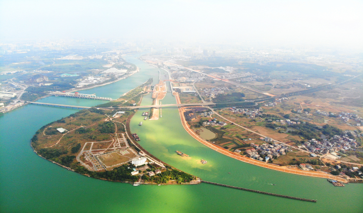 該工程為貴港航運(yùn)樞紐的擴(kuò)建工程,船閘有效尺度為長度280米、寬度34米、檻上水深5.8米,船閘主體段總長385.5米。船閘通航后,貴港航運(yùn)樞紐一線、二線船閘的年單向總通過能力達(dá)到4300萬噸,將有效解決一線船閘通航能力不足的問題。自2016年中旬工程開工建設(shè)以來,項目各參建方科學(xué)謀劃、精心組織,先后克服征地拆遷、工程量大、基坑滲水、洪水災(zāi)害等困難,順利解決了大體積混凝土溫控、鋼筋預(yù)埋模板拆除等技術(shù)難題,建成西江流域第二大船閘,打通了西江最卡脖子的入江“瓶頸”。