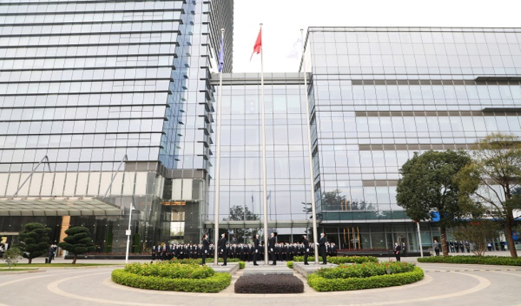 伴隨著《國(guó)歌》和《四航之歌》的鏗鏘旋律,五星紅旗和中國(guó)交建司旗在6名旗手的護(hù)衛(wèi)下冉冉升起。全體員工肅立仰望,行注目禮。