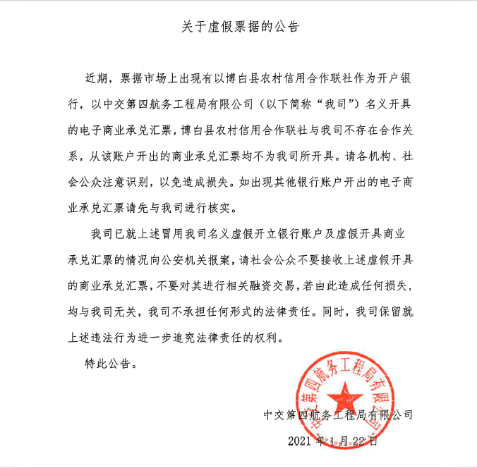 近期,票據(jù)市場(chǎng)上出現(xiàn)有以博白縣農(nóng)村信用合作聯(lián)社作為開戶銀行,以中交第四航務(wù)工程局有限公司(以下簡(jiǎn)稱“我司”)名義開具的電子商業(yè)承兌匯票,博白縣農(nóng)村信用合作聯(lián)社與我司不存在合作關(guān)系,從該賬戶開出的商業(yè)承兌匯票均不為我司所開具。請(qǐng)各機(jī)構(gòu)、社會(huì)公眾注意識(shí)別,以免造成損失。如出現(xiàn)其他銀行賬戶開出的電子商業(yè)承兌匯票請(qǐng)先與我司進(jìn)行核實(shí)。