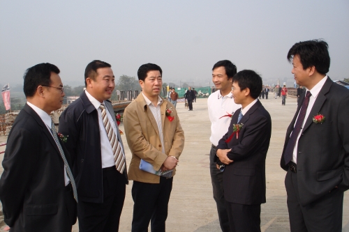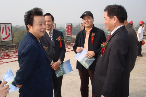5董事長(zhǎng) 黨委書(shū)記梁卓仁 總經(jīng)理孫國(guó)強(qiáng) 一公司經(jīng)理方嘉煊項(xiàng)目公司經(jīng)理李寶鋒 書(shū)記謝騰文 與湘潭市委書(shū)記陳潤(rùn)兒在大橋工地
