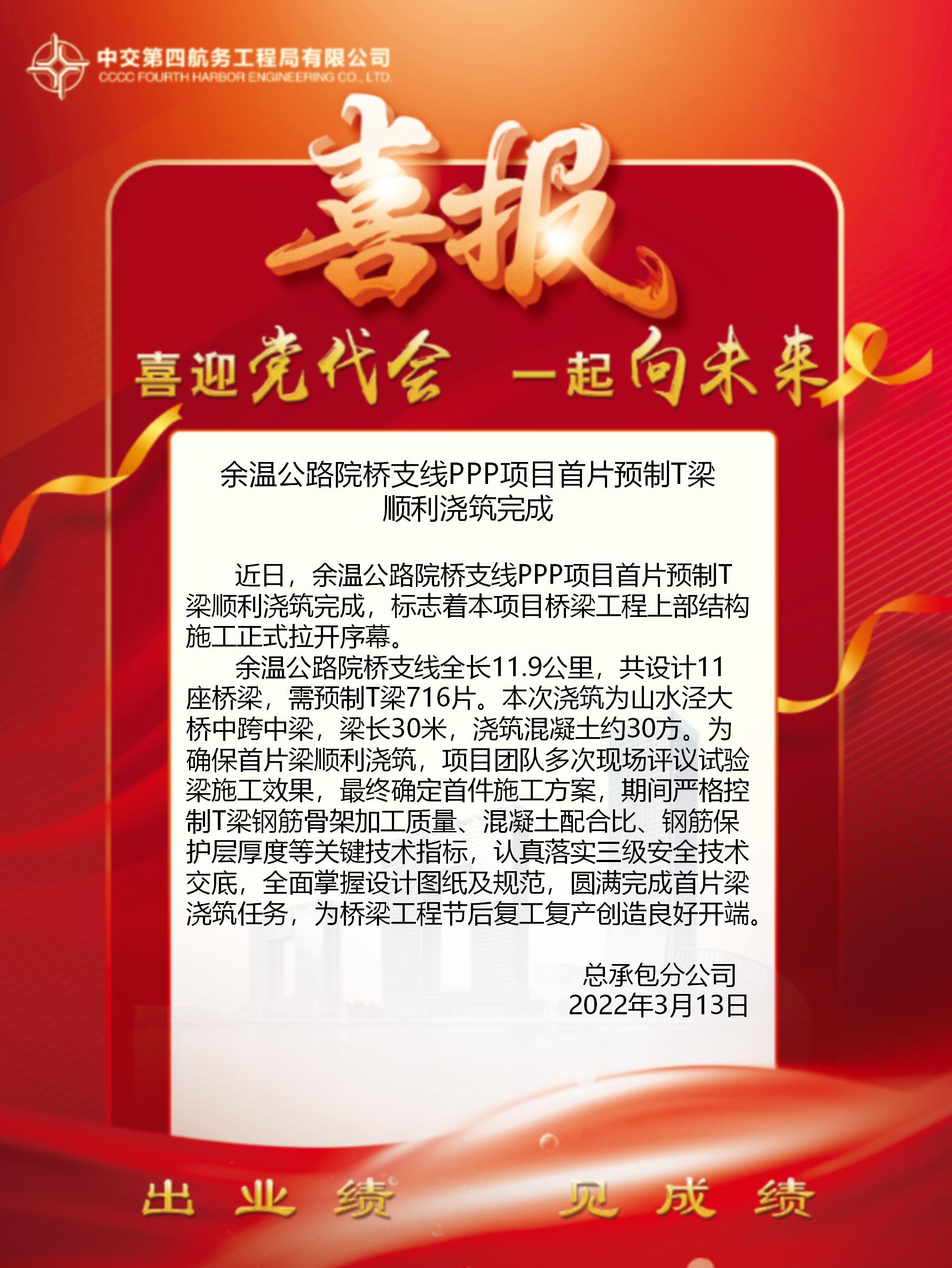 余溫公路院橋支線PPP項(xiàng)目首片預(yù)制T梁 順利澆筑完成