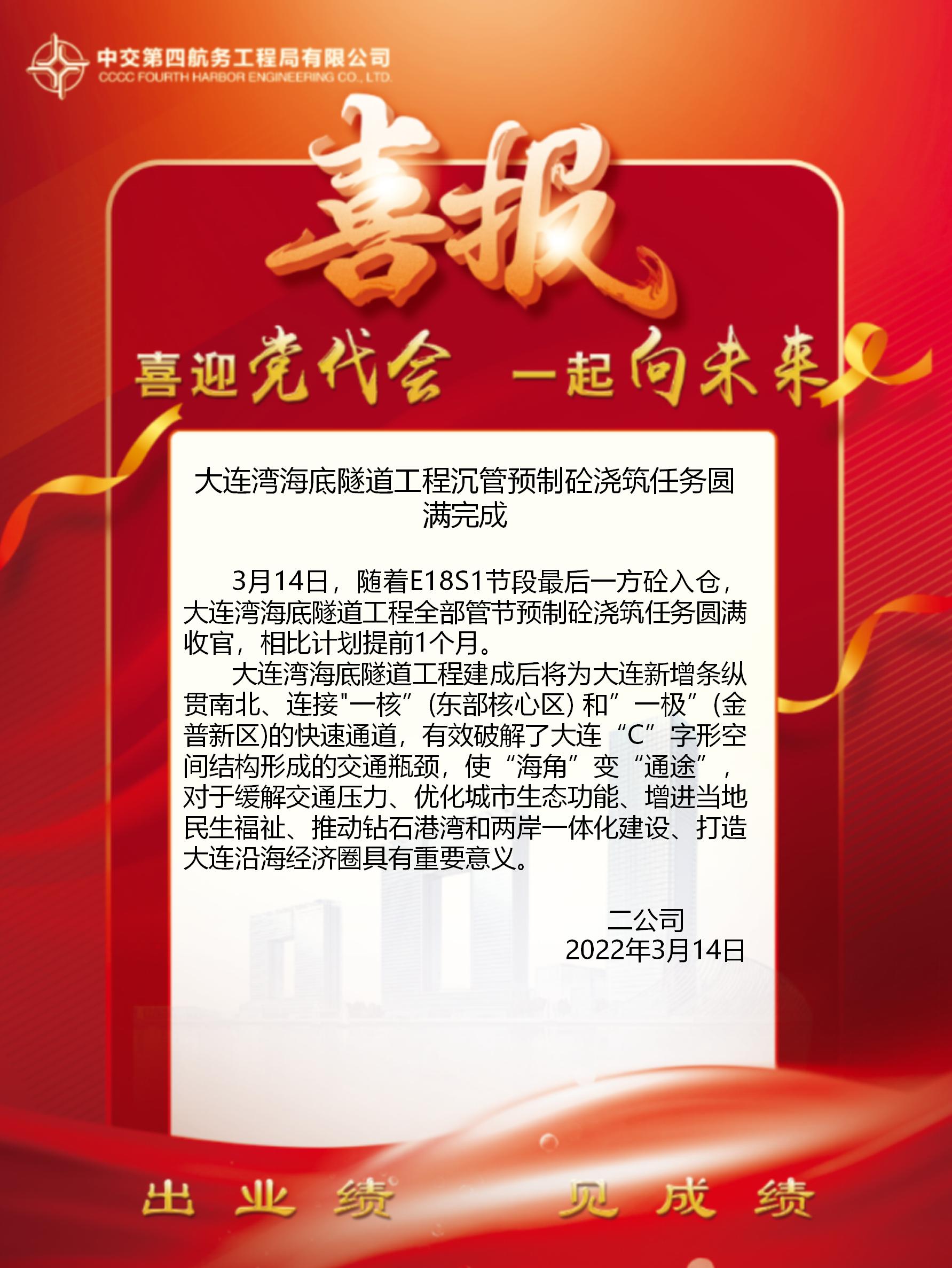 大連灣海底隧道工程沉管預(yù)制砼澆筑任務(wù)圓滿完成