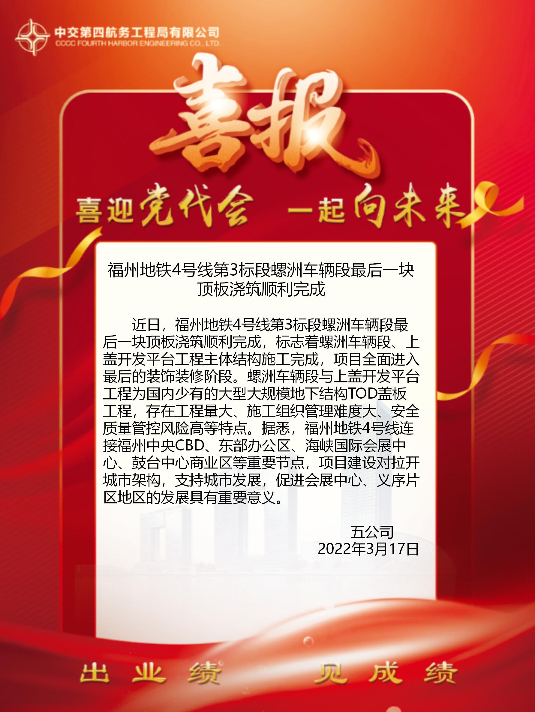 福州地鐵4號(hào)線第3標(biāo)段螺洲車輛段最后一塊頂板澆筑順利完成