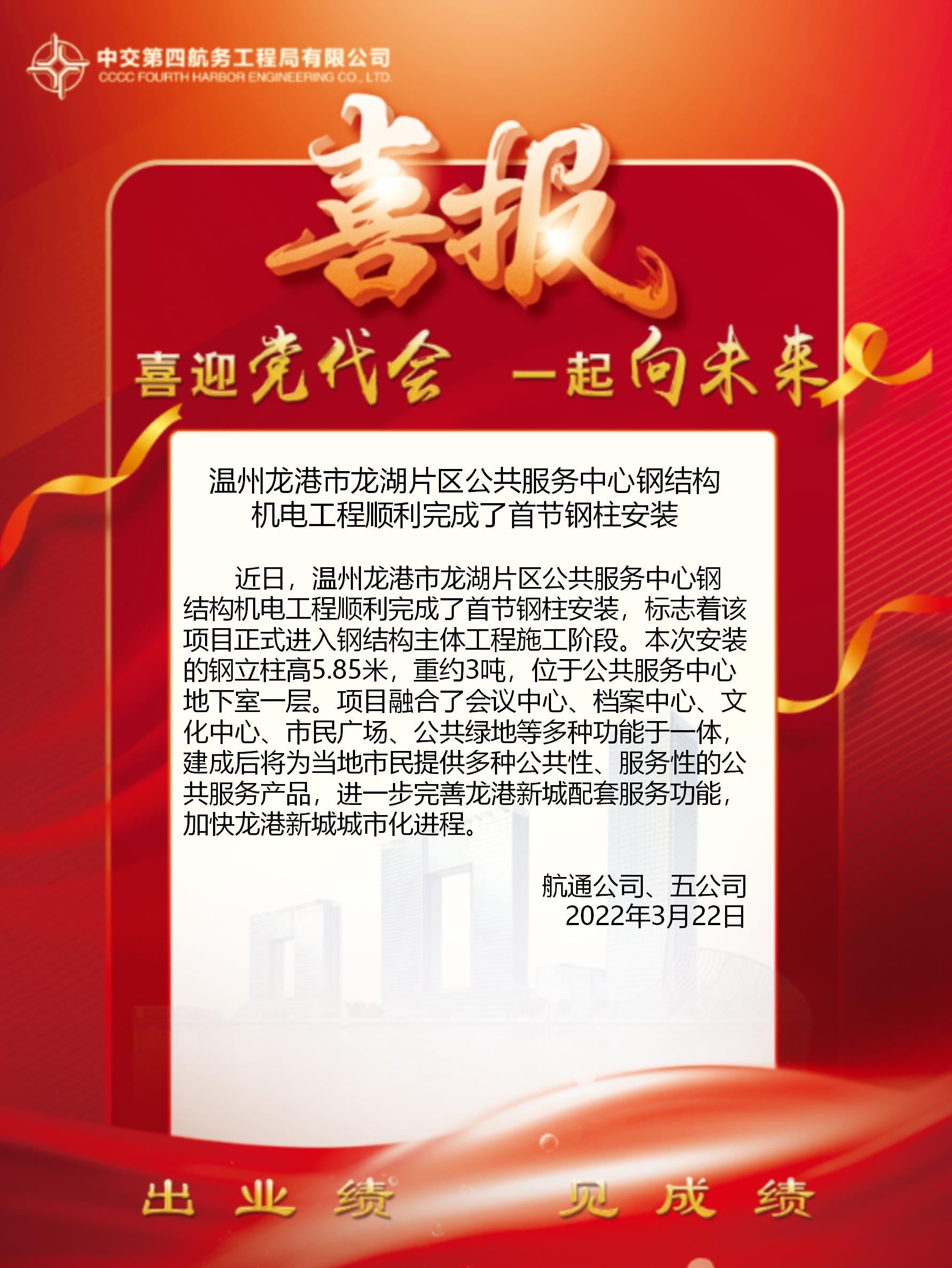 溫州龍港市龍湖片區(qū)公共服務(wù)中心鋼結(jié)構(gòu)機電工程順利完成了首節(jié)鋼柱安裝