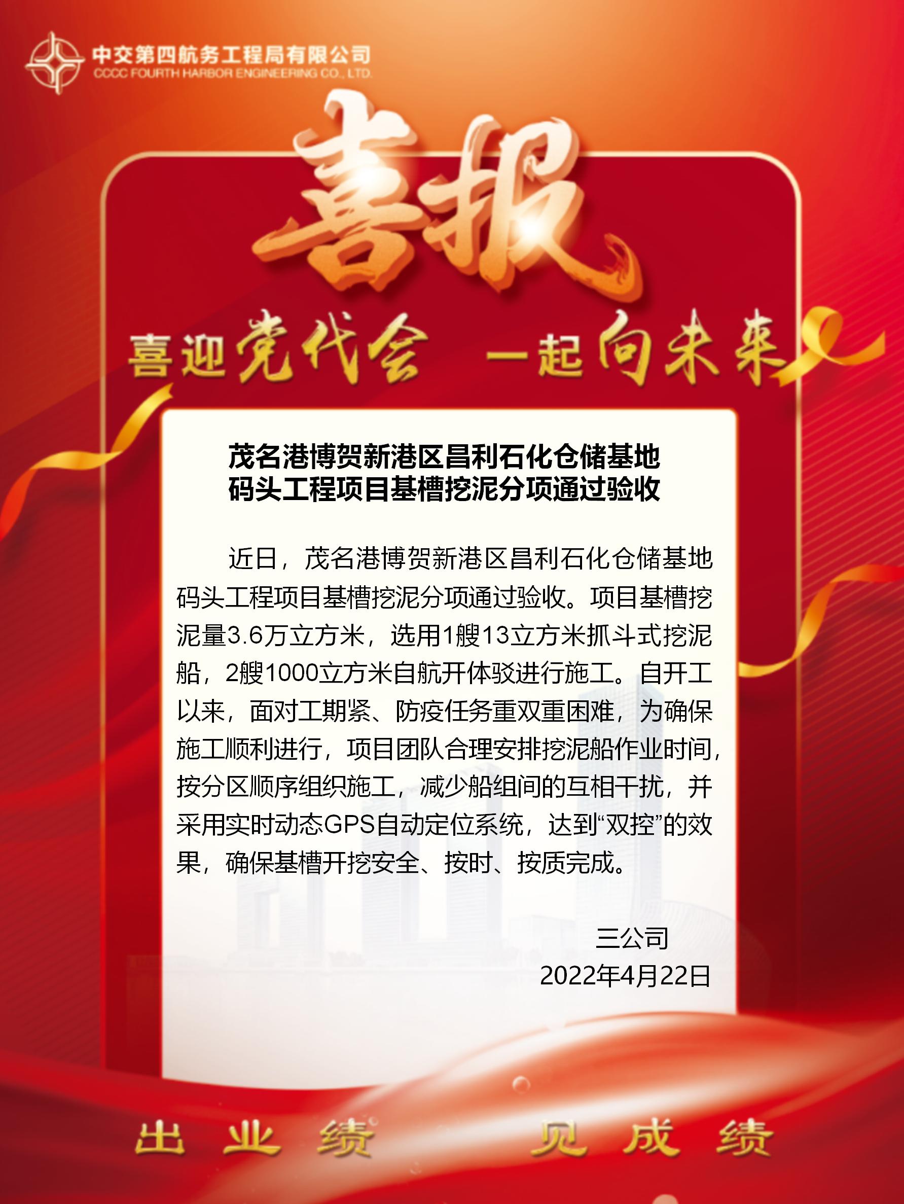 茂名港博賀新港區(qū)昌利石化倉(cāng)儲(chǔ)基地碼頭工程項(xiàng)目基槽挖泥分項(xiàng)通過(guò)驗(yàn)收