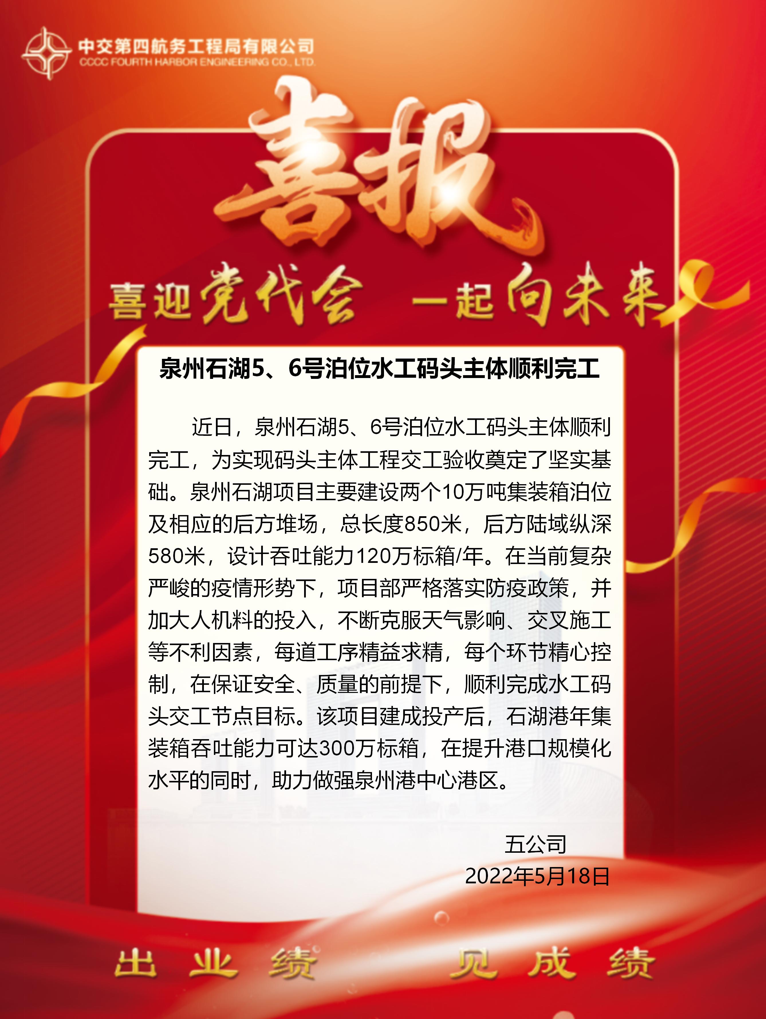 泉州石湖5、6號泊位水工碼頭主體順利完工