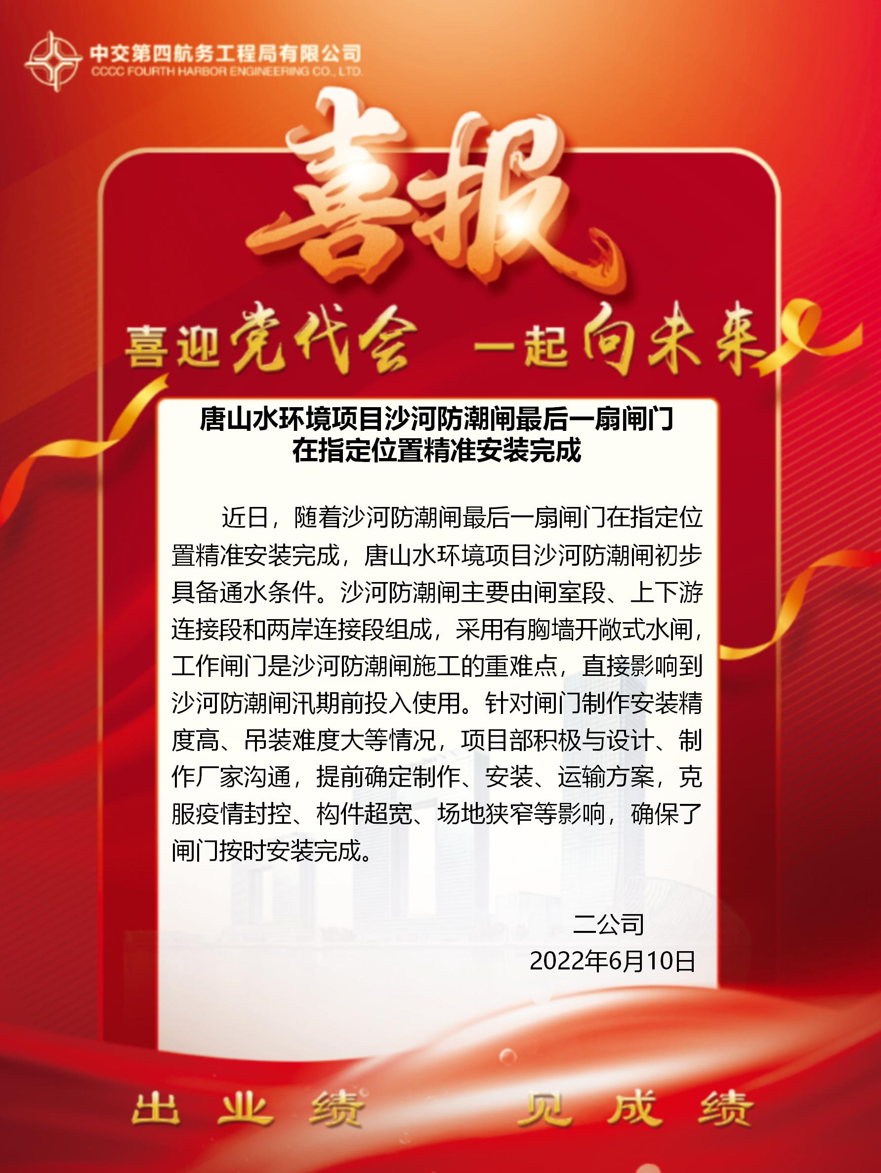 唐山水環(huán)境項(xiàng)目沙河防潮閘最后一扇閘門 在指定位置精準(zhǔn)安裝完成