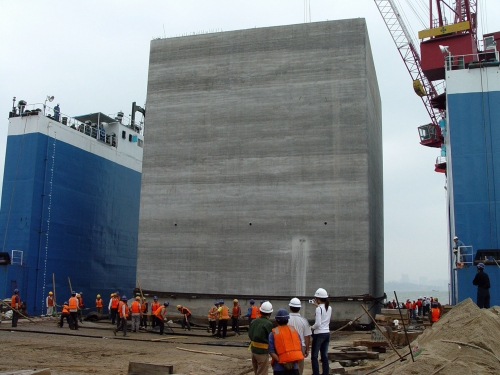 11月23日開始,分公司組織各方力量進(jìn)行第二次循環(huán),開始第二件沉箱出運(yùn)安裝典型施工。 圖為沉箱被搬上浮船塢"四航東南"號(hào)。 (嚴(yán)域晉)