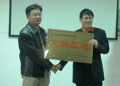 2007年1月17日,鹽田項目部雙喜臨門,先后得到業(yè)主鹽田國際頒發(fā)的"2006年度安全文明達標(biāo)先進單位"和深圳市港口工程質(zhì)量監(jiān)督站頒發(fā)的"2006年度文明工地"兩項殊榮。