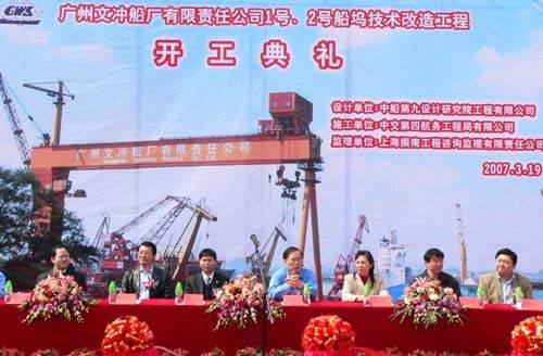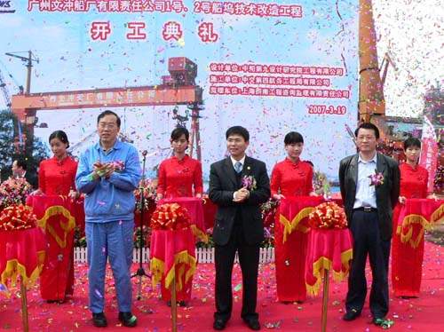 2007年3月19日,廣州文沖船廠1號、2號船塢技術(shù)改造工程舉行開工典禮。四航局有限公司孫國強總經(jīng)理、二公司經(jīng)理李惠明等出席了該儀式。孫國強總經(jīng)理代表四航局在儀式上致辭,他說四航局與廣州文沖船廠有限責任公司是多年的合作伙伴,很感謝該公司一直對四航局的信任和支持,我們將秉承為顧客創(chuàng)造精品的企業(yè)價值觀,出色完成1號、2號船塢技術(shù)改造工程。孫總經(jīng)理還與文沖船廠董事長徐國慶先生等為工程開工剪彩。