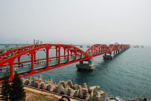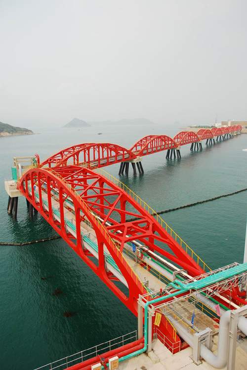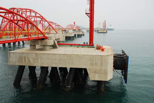 本工程為棧橋高樁墩臺(tái)開敞式碼頭,碼頭前沿離岸750米,泊位長(zhǎng)490米,由1個(gè)工作平臺(tái),2個(gè)靠船墩,6個(gè)系纜墩組成,工程是在原建15萬噸級(jí)碼頭的基礎(chǔ)上擴(kuò)建為30萬噸的原油碼頭。