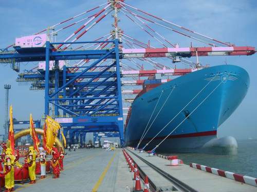 4月20下午3時,全球最大的貨輪之一"艾瑪·馬士基號"成功??吭诟V莘止踞詭Z1#泊位碼頭前沿,并吊起了開港"第一箱"的貨箱,廈門市長劉錫貴到會祝賀。