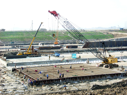 至6月上旬,已完成基坑開挖159萬立方米,占工程總量的96.2%;底板澆注任務已完成過半,兩個塢共完成48塊底板澆注;塢墻已澆注了三塊,第四塊正在加緊做好澆注前準備;鋼板樁施工方面,AU16鋼板樁施工任務已全部完成,AU14鋼板樁完成了64%;圍堰下止水旋噴樁施工已全部完成;水泵房施工目前正朝著"6.15節(jié)點"沖刺,其底板澆注共需要混凝土2900立方米,屆時,將持續(xù)施工60個小時。