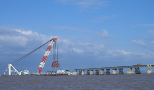 為了誠信履約,項目部領導率領全體員工以飽滿的工作熱情投入到施工中去,與一公司的員工通力合作,發(fā)揮團隊作戰(zhàn)的精神,努力克服候潮水作業(yè)、晚間施工等各種困難,安全優(yōu)質地完成每一片箱梁的安裝工作,并不斷挖掘安裝潛力,實現(xiàn)了單日安裝箱梁數(shù)突破4片的目標,使四船奮進船組的日安裝能力進一步得到提高。按業(yè)主月計劃要求5月24日至6月25日要完成G11-G15、G26-G40共36片箱梁安裝的任務,但在全體參與施工的員工的共同努力,于6月17日提前8天完成了月計劃任務。