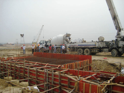 制梁臺座及橫移小車軌道梁的施工,是當前預制場區(qū)施工的一道關鍵工序,是按進度計劃開始箱梁預制的基礎。由于前幾天青島地區(qū)普降近百年一遇的大雨,施工現(xiàn)場積水大約3萬立方,項目部群策群力,在最短的時間內(nèi)將基坑的積水排出去。經(jīng)過緊張有序的前期準備工作,終于在15日開始澆注,并于下午4點澆注完畢,共澆筑完成201立方混凝土。