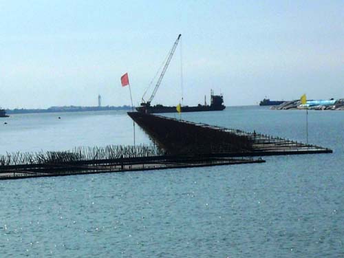 目前,沉箱后方棱體拋填分項工程已在緊鑼密鼓中進行,該分項工程共需拋石218275立方,計劃130個工作日。施工機械、人員安排已全部就緒,項目部領(lǐng)導(dǎo)每天親自去現(xiàn)場指揮,并專門召開了專題會議,精心策劃,周密部署,確保拋石順利進行,為后續(xù)施工創(chuàng)造有利條件。