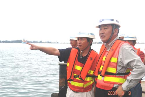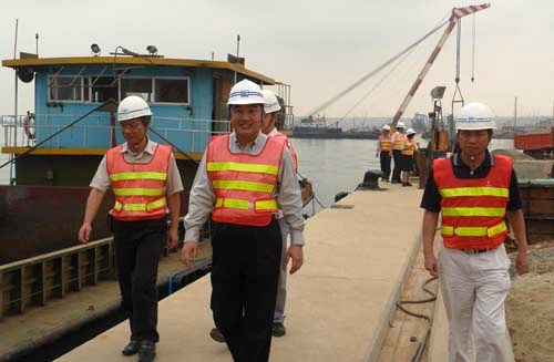 他察看了項目部預(yù)制場、主碼頭及離岸600米的油碼頭施工現(xiàn)場,驅(qū)車到采石場,登上多艘大型施工船舶全面了解工程進展、石料開采運輸情況和船容船貌、維修保養(yǎng)和船員生活情況。
