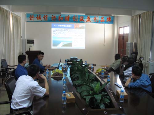 在歡迎與介紹會上,項目部對外國友人的到來表示熱烈的歡迎,并用多媒體的形式向外國友人介紹了陽江核電站南防波堤工程整體施工情況及其所采用的施工工藝,外國友人還饒有興趣地詢問了防波堤的石料的來源和各類護面塊體的預制、吊安工藝等情況。