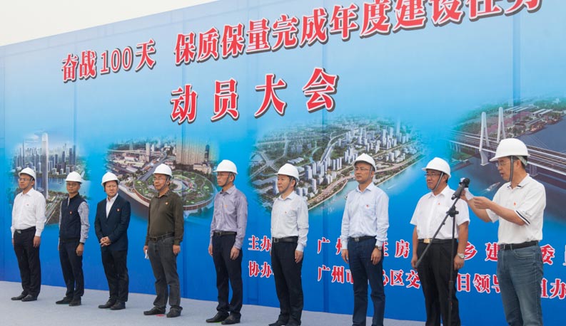 動員大會上,廣州市中心區(qū)交通項目領導小組辦公室主任祖冠周闡述了“奮戰(zhàn)一百天 保質(zhì)保量完成年度建設任務”主題活動的目的、意義和任務安排,為活動指明了方向、注入了動力。他表示,廣州市項目辦將重點抓好項目統(tǒng)籌、形象進度、項目前期、質(zhì)量安全、活動實效等五個方面的工作,全力打贏打好“奮戰(zhàn)一百天”攻堅戰(zhàn),高標準高質(zhì)量完成好全年各項目標任務。廣州市住房和城鄉(xiāng)建設委員會副主任齊懷恩宣布主題活動正式啟動。為全力打贏打好年度城建攻堅戰(zhàn),齊懷恩要求:一是要思想上緊起來,振奮精神鼓勁加油;二是要行動上干起來,攻堅克難責任到人;三是要成效上實起來,保質(zhì)保量完成任務。