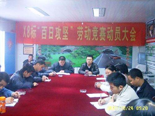 10月24上午,一公司湖北滬蓉西X8標(biāo)項(xiàng)目部召開以該公司的"兩創(chuàng)一保"、滬蓉西指揮部的"四比四保"為主題的"百日攻堅(jiān),確保年底隧道左洞安全順利貫通"勞動競賽活動誓師動員大會。項(xiàng)目部各部門都簽訂了"百日攻堅(jiān)"勞動競賽責(zé)任目標(biāo)書。
