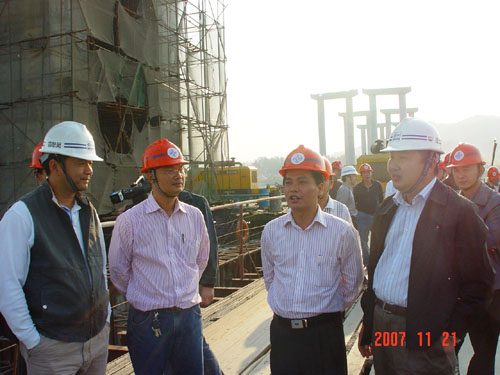 梁卓仁首先察看了富灣特大橋55、56號主墩工區(qū),他對富灣大橋項目部想方設(shè)法克服"7.18沉船撞塌施工棧橋事件"、"樁基施工溶洞處理"等困難,保證施工進度表示肯定;之后,他到廣明高速3、4標工地,對該標段自6月以來在業(yè)主組織的勞動競賽中爭先創(chuàng)優(yōu)、確保進度的表現(xiàn)給予肯定。