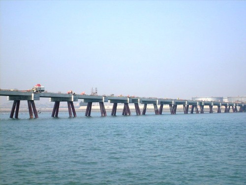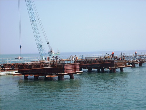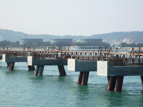 經(jīng)過項目部員工努力奮戰(zhàn),目前,引橋橋墩已全部澆注完成、引橋預(yù)應(yīng)力空心T字梁板連接510米、可通車引橋橋面近400米,完成工程總量的65%,大大提高了碼頭主體的施工效率。