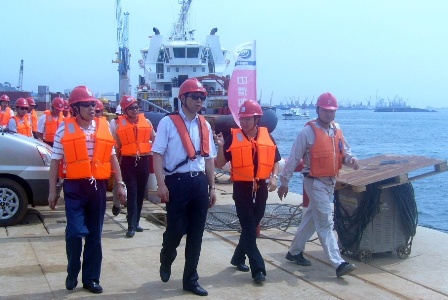 在我公司負(fù)責(zé)施工的安哥拉石油基地重力式碼頭和油碼頭勝利完工之際,中交集團(tuán)總裁孟鳳朝率集團(tuán)子公司有關(guān)領(lǐng)導(dǎo)共十四人組成的考察團(tuán)遠(yuǎn)赴西非對(duì)安哥拉進(jìn)行了為期四天的考察,我公司總經(jīng)理孫國(guó)強(qiáng)等隨行考察。
