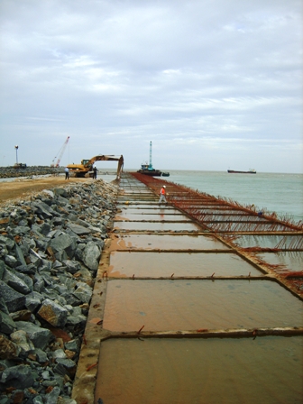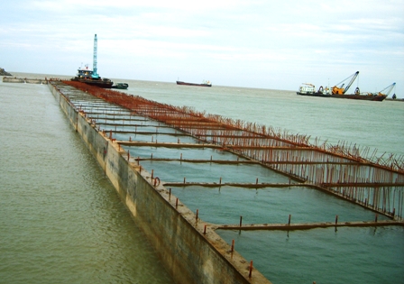 自5月4日安裝沉箱以來,該項(xiàng)目部緊張有序地做好每個沉箱出運(yùn)安裝的各項(xiàng)準(zhǔn)備工作,在確保安全的前提下不斷總結(jié)優(yōu)化縮短沉箱安裝時間,努力克服八所地區(qū)惡劣季風(fēng)氣候和八所港作業(yè)相互干擾出運(yùn)安裝的影響,見縫插針,積極創(chuàng)造條件,項(xiàng)目部及時調(diào)整方案優(yōu)化資源配置,采取了一系列相應(yīng)的措施,盡量減少對整個安裝工期的影響,累計(jì)在季風(fēng)影響10天不能安裝的情況下,通過項(xiàng)目部和參戰(zhàn)的船組的共同努力拼搏,用不到33天的時間將17件單件重為1580噸的沉箱順利安全地安裝完,創(chuàng)造了四航局安裝大件沉箱的歷史最好成績。