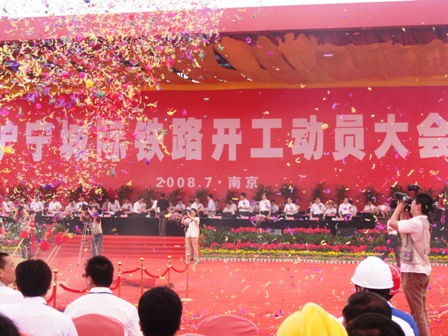 7月1日,滬寧城際鐵路開工動員大會在南京仙林召開,標志著備受矚目的滬寧城際鐵路正式開工建設。大會由江蘇省省長羅志軍主持,中共中央政治局委員、上海市委書記俞正聲宣布工程開工,鐵道部部長劉志軍、江蘇省委書記梁保華、上海市市長韓正分別發(fā)表講話。