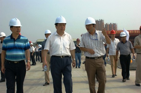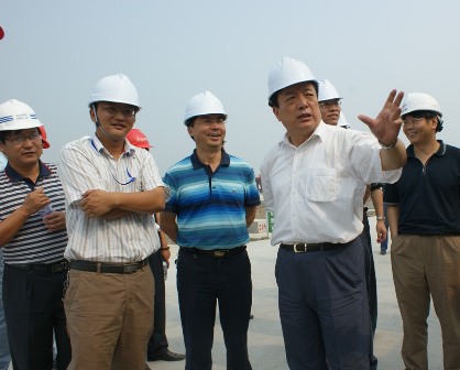 8月13日,原鐵道部副部長(zhǎng)、現(xiàn)任京滬高鐵有限公司董事長(zhǎng)蔡慶華在中交京滬高鐵項(xiàng)目部副總經(jīng)理王建一行的陪同下視察了四航局上海嘉定制梁場(chǎng)。