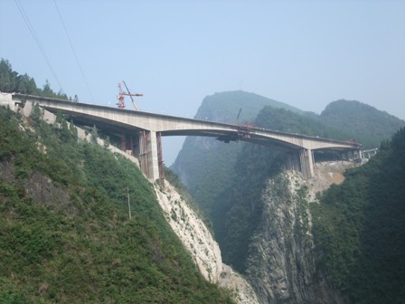 沿溪溝特大橋是渝湘高速公路控制性工程之一,位于重慶黔江區(qū)正陽(yáng)鎮(zhèn)境內(nèi),跨越斷裂型溶蝕大峽谷,橋面至谷底距離約280米。分左右幅橋,橋梁與路基同寬(24.5米),由主橋和引橋構(gòu)成,共14跨(左幅6跨,右幅8跨),主橋主跨達(dá)150米,是高速公路建設(shè)領(lǐng)域全國(guó)第二的混凝土連續(xù)箱梁橋。