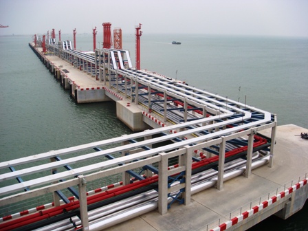 中國石油廣西石化10萬噸級原油碼頭工程位于廣西欽州港鷹嶺作業(yè)區(qū)內(nèi),工程造價為2.78億元,總工期為13個月,工期之緊為華南港工碼頭建設以來之罕有。其建設規(guī)模為2個10萬噸級原油卸船泊位、2個5千噸級和2個3千噸級的成品油卸船泊位。碼頭全長609米,寬36米,整個碼頭呈"L型"布置,碼頭為離岸重力式結(jié)構(gòu)。