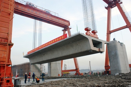 經(jīng)過前期詳細籌劃,架梁各項準備工作就緒,在現(xiàn)場指揮人員的指揮下,兩臺450噸提梁機緩緩將箱梁穩(wěn)穩(wěn)提起,歷時2個小時,箱梁被準確、平穩(wěn)地安放在指定墩身。首片箱梁成功架設(shè)為日后的架梁工作積累了寶貴的經(jīng)驗。預(yù)計年前將完成14片箱梁的架設(shè)任務(wù)。