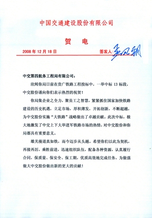 中交股份發(fā)來賀電稱贊四航局為"大鐵路"戰(zhàn)略增添了輝煌的一頁