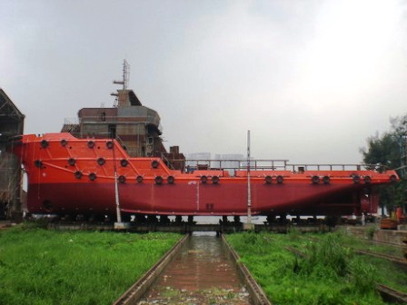 1月5日,航通公司為新加坡某公司建造的58.7米多用途工作船(第20號)順利下水。