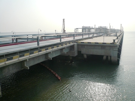 該工程由2個8萬噸級泊位(南側(cè)的8萬噸級泊位水工結(jié)構(gòu)按靠泊位15萬噸級船舶設(shè)計)和4個5000噸級石化泊位(水工結(jié)構(gòu)按靠泊1萬噸級船舶設(shè)計)組成,為突堤高樁梁板及高樁墩式結(jié)構(gòu)。