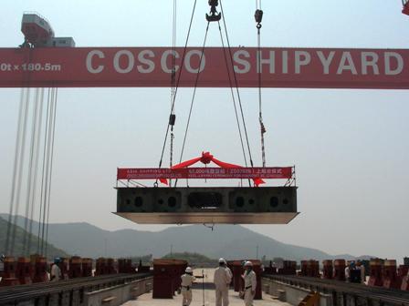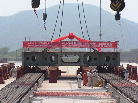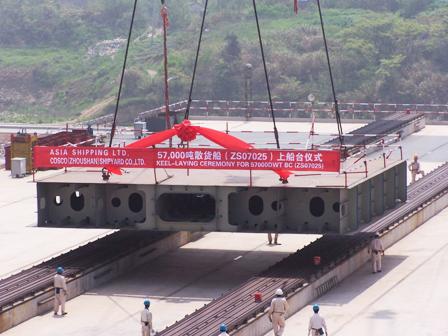 4月15日,隨著首個造船分段的順利安放,舟山中遠一號船臺正式投入試生產(chǎn)。