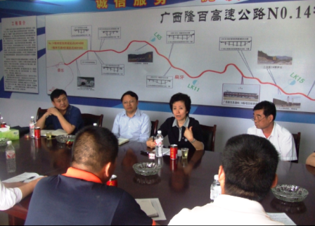 4月17日下午,中交投資有限公司黨委書記、副總經(jīng)理蘇佩璋,副總經(jīng)理蔣昌貴一行在隆百項(xiàng)目公司張存懷總經(jīng)理和閔毅總工程師的陪同下到一公司廣西隆百高速14標(biāo)項(xiàng)目部調(diào)研。