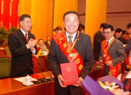 中共中央政治局委員、廣東省委書記汪洋親自為梁卓仁頒發(fā)獎(jiǎng)?wù)潞妥C書