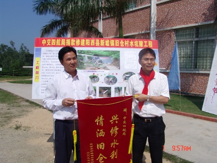 同時,由四航局出資5.6萬元,于5月26日順利完工的舊倉村水坑陂工程竣工儀式同時在活動現(xiàn)場舉行。該工程具有"排、引、灌"等水利三大功能,可解決舊倉村1300多畝農(nóng)田的灌溉問題,為推廣現(xiàn)代化農(nóng)業(yè)夯實了基礎(chǔ),為確保農(nóng)民增收創(chuàng)造了有利條件。舊倉村黨支部書記馬英深代表舊倉村4628名村民向四航局總經(jīng)理孫國強(qiáng)贈送了錦旗,感謝四航局解決了村民種田"灌溉難"的問題。