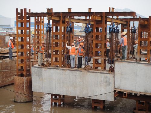 6月11日,舟山項(xiàng)目部成功完成舟山中遠(yuǎn)二號(hào)船臺(tái)首榀水下井字梁的安裝,攻克了繼鋼套箱圍堰后又一個(gè)技術(shù)難點(diǎn),也為7月底完成船臺(tái)工程打下了堅(jiān)實(shí)基礎(chǔ)。