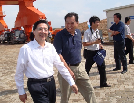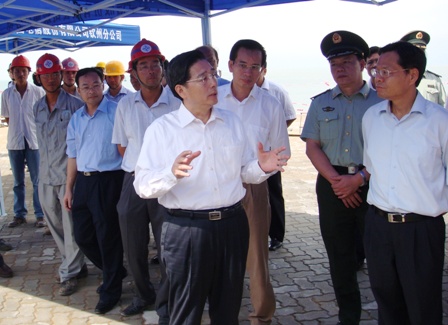 7月22日上午,廣西壯族自治區(qū)黨委書記、人大主任郭聲琨,自治區(qū)副主席陳武一行在欽州市委書記湯世保、市長張曉欽、廣西北部灣國際集團董事長葉時湘、中石油廣西石化總經理吳恩來等領導的陪同下,視察三公司欽州港項目部承建的大欖坪保稅港區(qū)1號、2號泊位碼頭以及正在籌建開工的3號-8號泊位、30萬噸油碼頭工地。