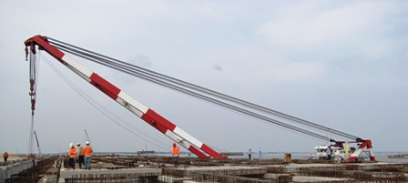 寶滿集裝箱碼頭構(gòu)件共1454件,其中前后軌道梁共140件,后軌道梁?jiǎn)胃剡_(dá)70噸,跨距39米,安裝準(zhǔn)確率及安全性要求高,安裝難度大。為此,項(xiàng)目部積極找尋合作單位及船機(jī)資源,嚴(yán)格控制成本,對(duì)聯(lián)合起吊工藝、杠桿起吊工藝、船機(jī)改造等方案進(jìn)行反復(fù)論證與測(cè)試,最終確定由"粵惠州工9628"實(shí)施安裝。