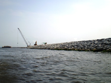拉各斯防波堤修復(fù)工程由東堤、西堤和導(dǎo)流堤組成,其中東堤修復(fù)約150米,西堤修復(fù)約250米,導(dǎo)流堤修復(fù)約500米。從今年2月份開始,該項(xiàng)目部全面鋪開石料開采、扭王塊預(yù)制及石料水上運(yùn)輸拋填等各項(xiàng)工作。隨著下半年尼日利亞國(guó)內(nèi)治安形勢(shì)有不斷惡化的趨勢(shì)和存在不確定的匯率風(fēng)險(xiǎn),項(xiàng)目部一致認(rèn)為應(yīng)對(duì)目前困難和抓住機(jī)遇的最好辦法,就是加快工程進(jìn)度,多出產(chǎn)值。