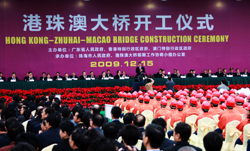 中共中央政治局委員、廣東省委書記汪洋,交通運(yùn)輸部部長(zhǎng)李盛霖,廣東省省長(zhǎng)黃華華,香港特別行政區(qū)行政長(zhǎng)官曾蔭權(quán),澳門特別行政區(qū)行政長(zhǎng)官何厚鏵、候任行政長(zhǎng)官崔世安,以及中交總裁孟鳳朝、副總裁陳奮健、總工程師林鳴出席了開(kāi)工儀式。四航局董事長(zhǎng)、黨委書記梁卓仁、總經(jīng)理孫國(guó)強(qiáng)、總工程師呂衛(wèi)清和參建員工代表應(yīng)邀出席開(kāi)工儀式,并受到李克強(qiáng)副總理的親切接見(jiàn)。
