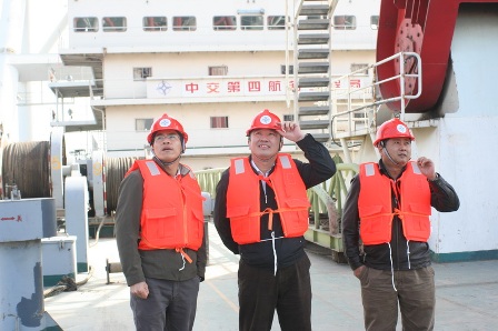 4月7日,四航局董事長、黨委書記梁卓仁在二公司副總經(jīng)理歐陽麟樺的陪同下,到青島海灣大橋工程施工現(xiàn)場及"四航奮進號"船組指導工作。