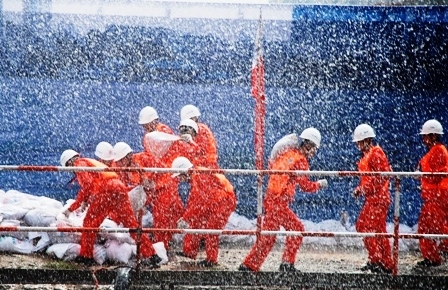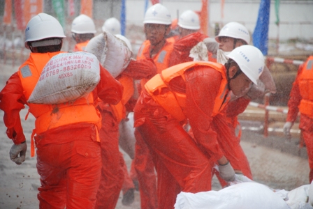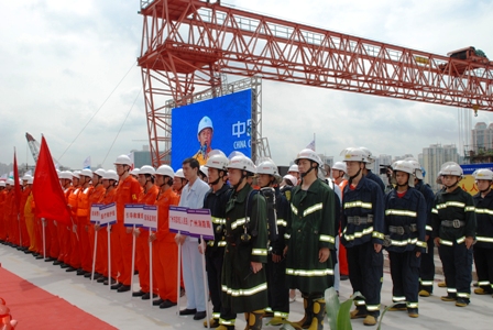 進入6月份以后,臺風、暴雨等惡劣天氣將顯著增多,華南地區(qū)各施工項目將面臨重大考驗。為切實落實"安全第一,預(yù)防為主,綜合治理"的方針,實地檢驗處理突發(fā)事件的能力,6月20日,中交股份在中交四航局承建的廣州市洲頭咀隧道進行了一場大型的防臺風、防坍塌實景模擬大型演練。國務(wù)院國資委綜合局副局長劉源、國家安監(jiān)總局監(jiān)管二司副司長王力爭、住房和城鄉(xiāng)建設(shè)部工程質(zhì)量安全監(jiān)管司副司長王樹平、國家應(yīng)急救援指揮中心協(xié)調(diào)部副主任胡學(xué)義、廣州市人民政府副秘書長張火青、中國交通建設(shè)股份有限公司副總裁侯金龍、中交四航局總經(jīng)理孫國強等領(lǐng)導(dǎo)出席此次演練活動。