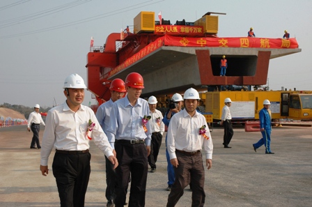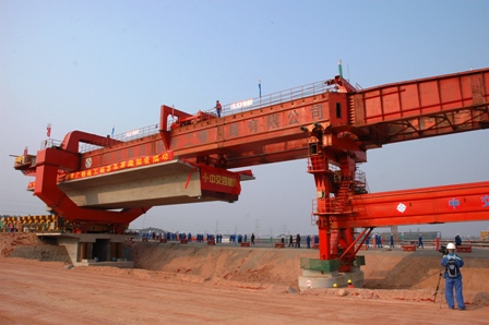 設計時速200公里的貴廣鐵路是國家和鐵道部重大投資項目之一,四航局承建貴陽至廣州鐵路站前工程GGTJ-13標段,全長38.67公里,共需預制架設452孔箱梁。每片箱梁長32.6米、寬12.2米、高3.09米、重760噸,四航局貴廣二項目部采用1臺900噸運梁車和1臺900噸架橋機配合進行運梁和架設?,F(xiàn)場人員嚴格按照預先制定的方案和操作規(guī)程,環(huán)環(huán)相扣、精心操作,確保了箱梁架設既安全順利,又精確到位。