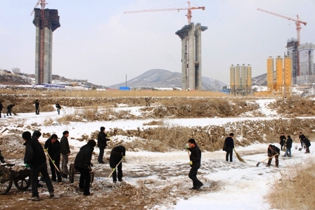 為了盡快恢復(fù)施工生產(chǎn),大雪一停,項(xiàng)目部領(lǐng)導(dǎo)便帶領(lǐng)施工人員拿著鐵鍬、掃帚開(kāi)始除雪鏟冰。大家不畏嚴(yán)寒,團(tuán)結(jié)協(xié)作,經(jīng)過(guò)近三個(gè)小時(shí)的共同努力,成功將攪拌站至溫河大橋5號(hào)墩的施工便道積雪清掃一空。隨后,項(xiàng)目部安排裝載機(jī)在清掃出來(lái)的路面鋪上碎石粉,為攪拌車(chē)將混凝土安全輸送到5號(hào)墩滑模施工現(xiàn)場(chǎng)提供了可靠保障。
